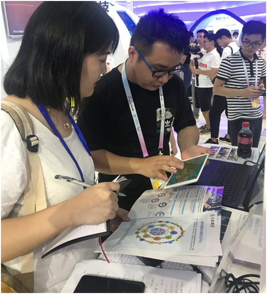 今天是開(kāi)幕式,也是專(zhuān)業(yè)觀(guān)眾觀(guān)展的第一天,樂(lè )教集團就已經(jīng)吸引了不少相關(guān)企業(yè)的興趣和關(guān)注,我們的負責人也接受了大批媒體的參訪(fǎng),展臺前圍滿(mǎn)了人。