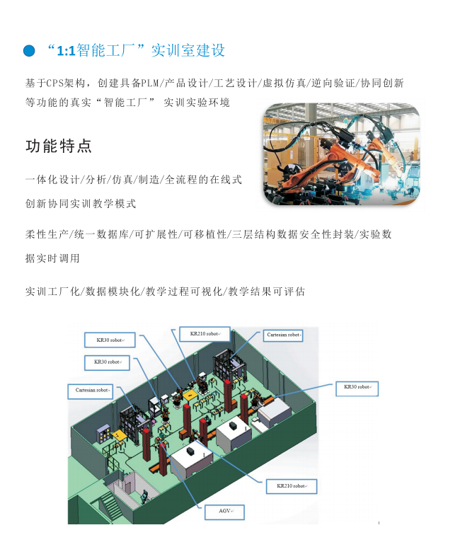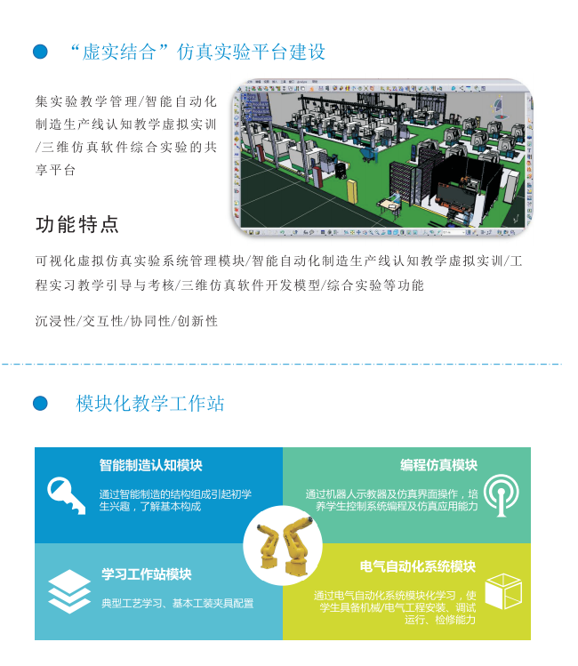 針對智能制造教育,為高等院校/中職院校全力打造智能制造創(chuàng )新教學(xué)體系建設(專(zhuān)業(yè)建設/師資培養/教學(xué)管理服務(wù)/資格證書(shū)認定/協(xié)同創(chuàng )新教學(xué)環(huán)境搭建);提供“1:1智能工廠(chǎng)”實(shí)驗室/“虛實(shí)結合”仿真實(shí)驗平臺/數字資源及現代應用技術(shù)實(shí)驗室建設,實(shí)現從虛擬到現實(shí)的智能制造實(shí)訓教學(xué)平臺。
